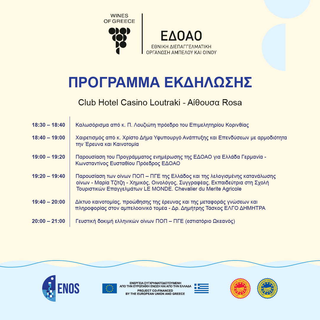 Η Εθνική Διεπαγγελματική Οργάνωση Αμπέλου και Οίνου (ΕΔΟΑΟ) με την υποστήριξη του Επιμελητηρίου Κορινθίας σας προσκαλούν στην παρουσίαση και γευστική δοκιμή ελληνικών οίνων ΠΟΠ και ΠΓΕ την Τετάρτη 29 Μαρτίου 2023 στις 18:30, στην αίθουσα Rosa στο Club Hotel Casino, στο Λουτράκι.