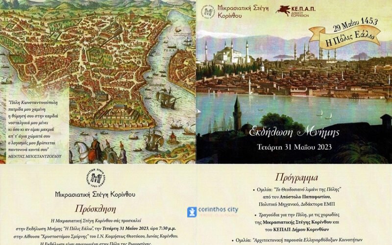 Ο Δήμος Κορινθίων θα συμμετάσχει στην ετήσια εκδήλωση «Η ΠΟΛΙΣ ΕΑΛΩ», που διοργανώνει η Μικρασιατική Στέγη Κορίνθου, την Τετάρτη 31 Μαΐου 2023, και ώρα 19:30μ.μ, στην αίθουσα Αγίου Χρυσοστόμου Σμύρνης του Ι. Ναού Κοιμήσεως της Θεοτόκου, Ιωνίας Κορίνθου.